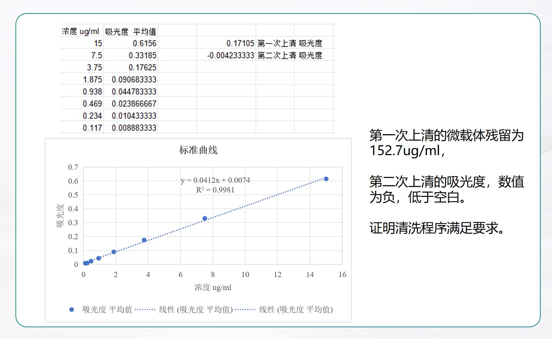 生化法检测 D4细胞微载体裂解, PBS第一次和第二次清洗后, 上清微载体残留, 第二次清洗后残留满足要求。 两次离心即可达到微载体残留 低于检测线。