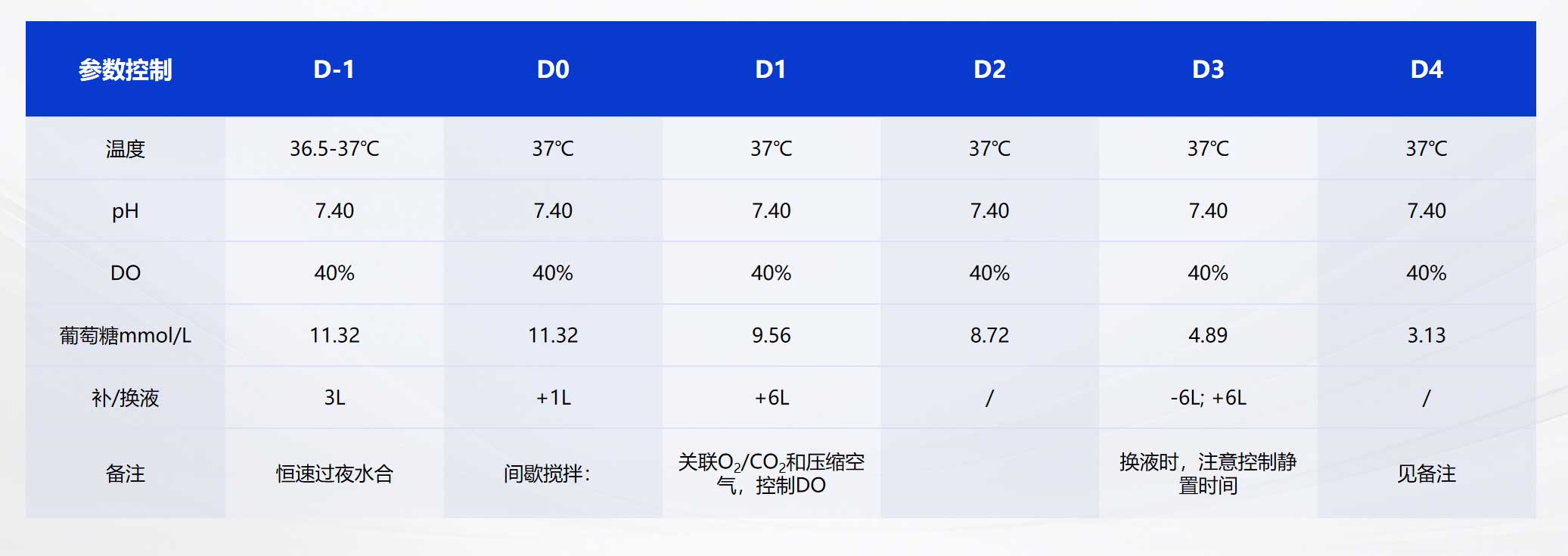 • 50L二级反应罐,1g/L,培养体积40L,接种2E9细胞 D4扩增20倍,收获4E10细胞量。