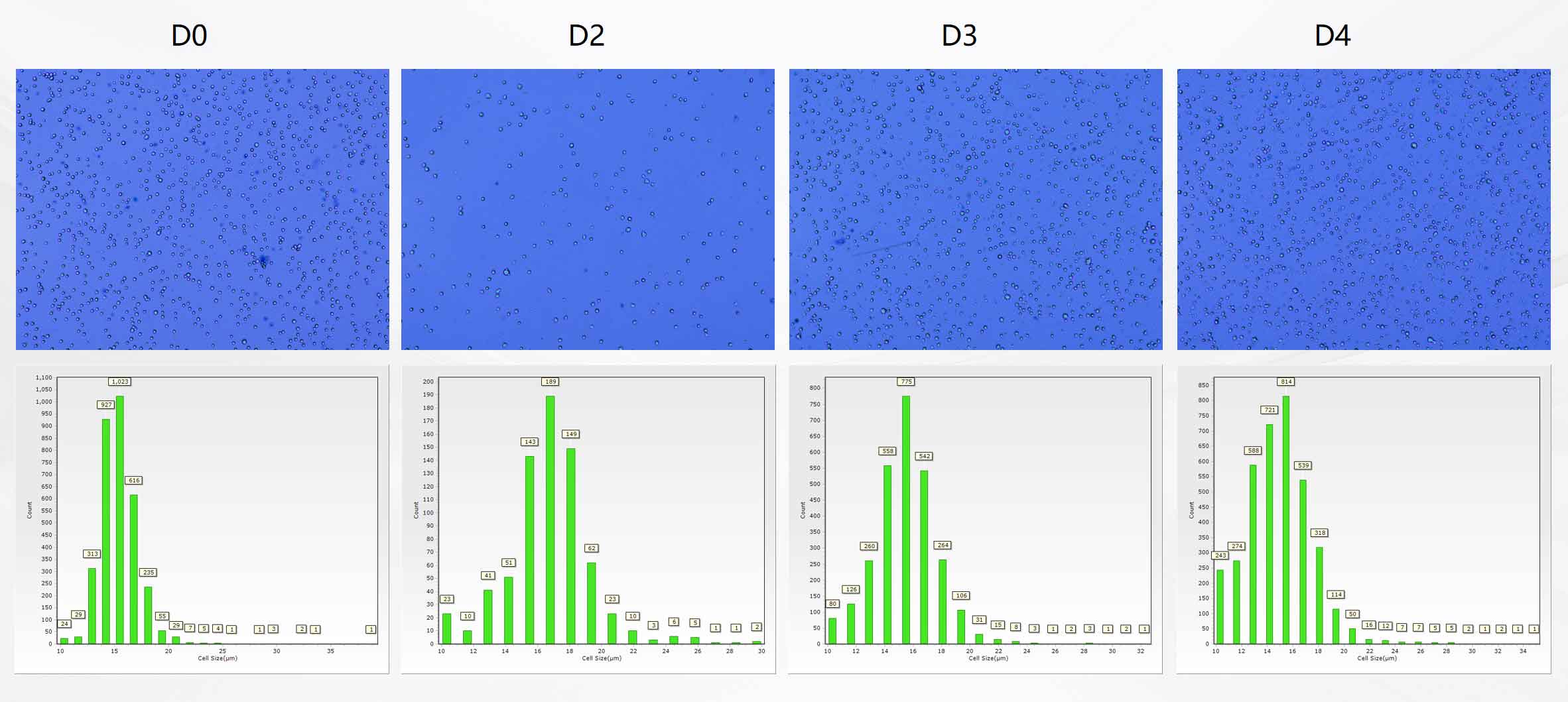 (2)细胞收获:3D 10L反应器培养3天,细胞数量99.83亿,扩增16.64倍,细胞活率98.16%;培养4天,取样计数,细胞总量150.2亿;经PBS洗涤后,加入裂解液消化微载体后,收获细胞121.8亿,扩增20.3倍,活率97.64%,细胞直径14.88μm,符合细胞培养收获标准。