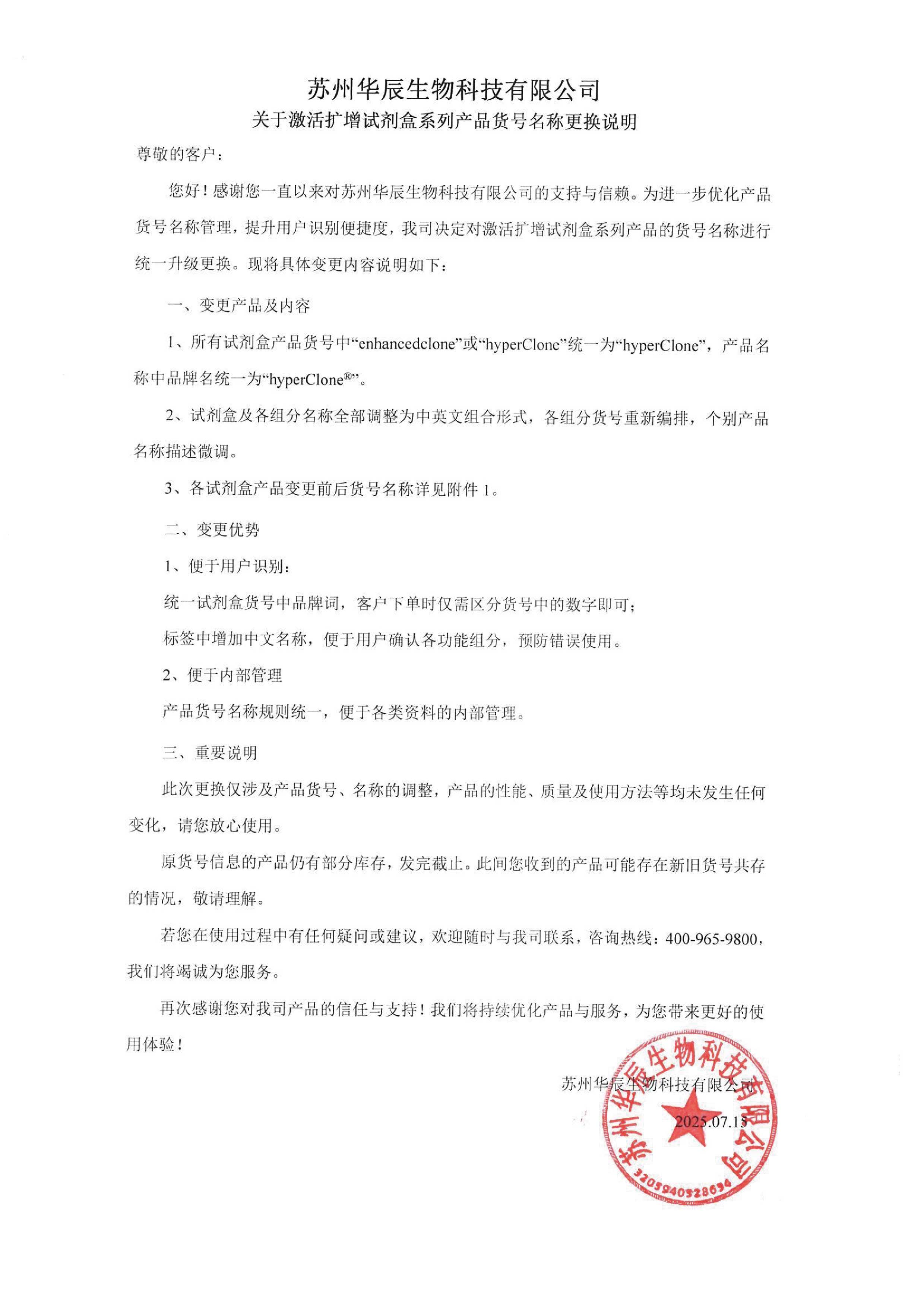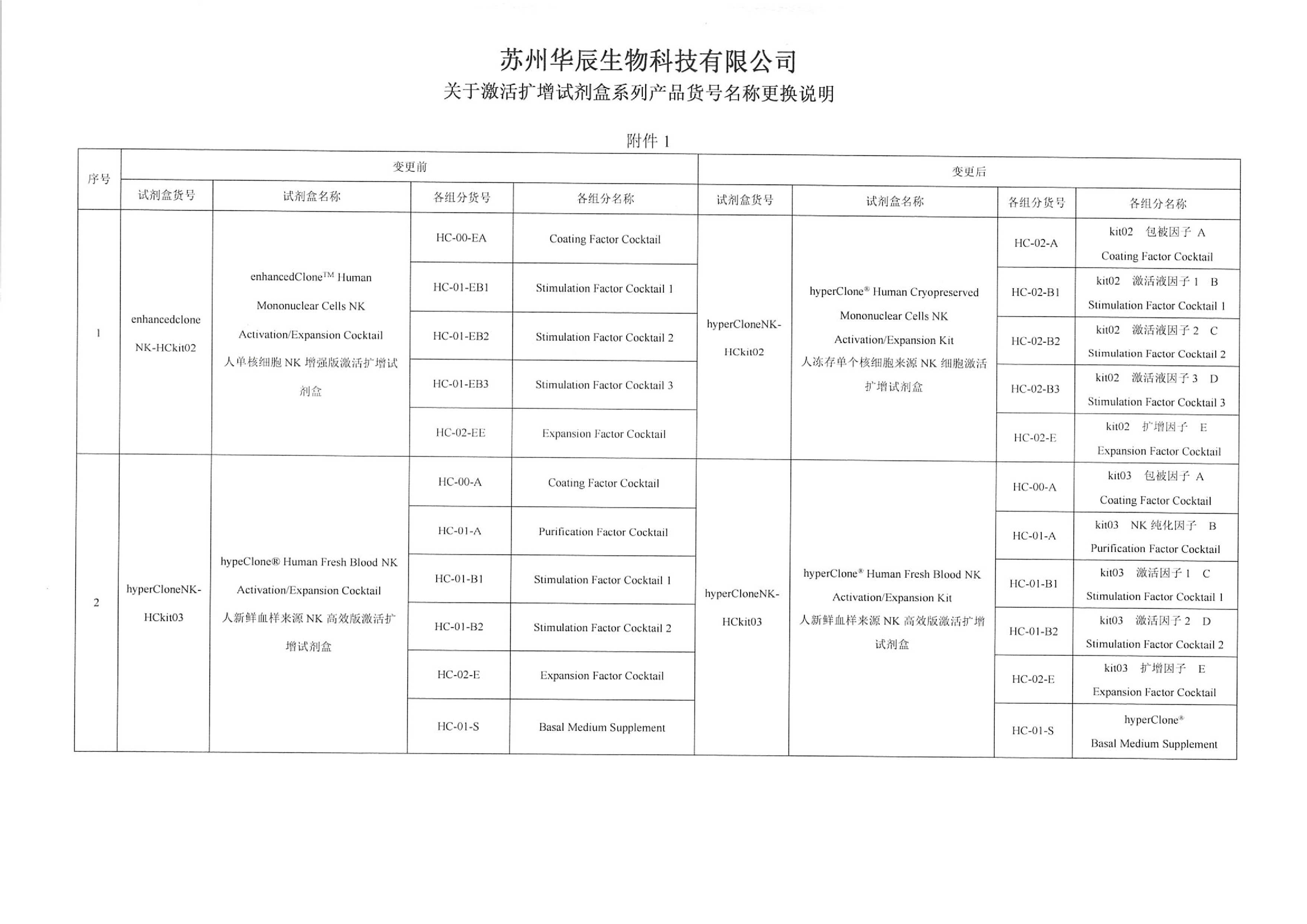 通知:华辰生物NK细胞激活扩增试剂盒系列产品货号名称变更说明