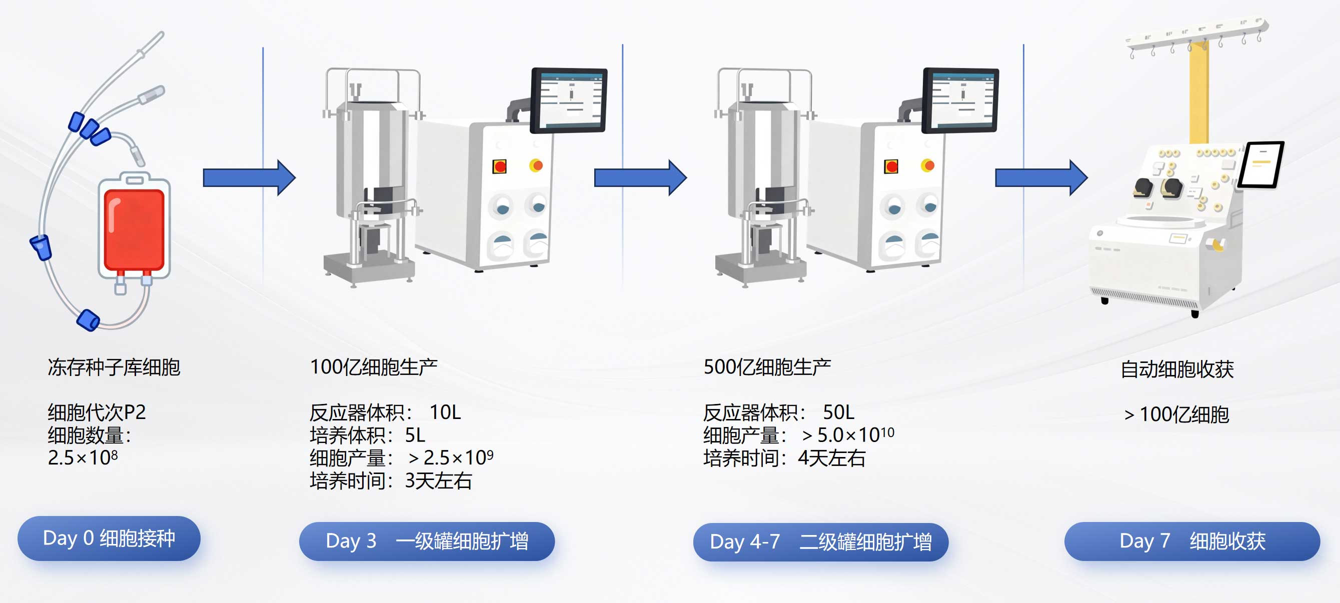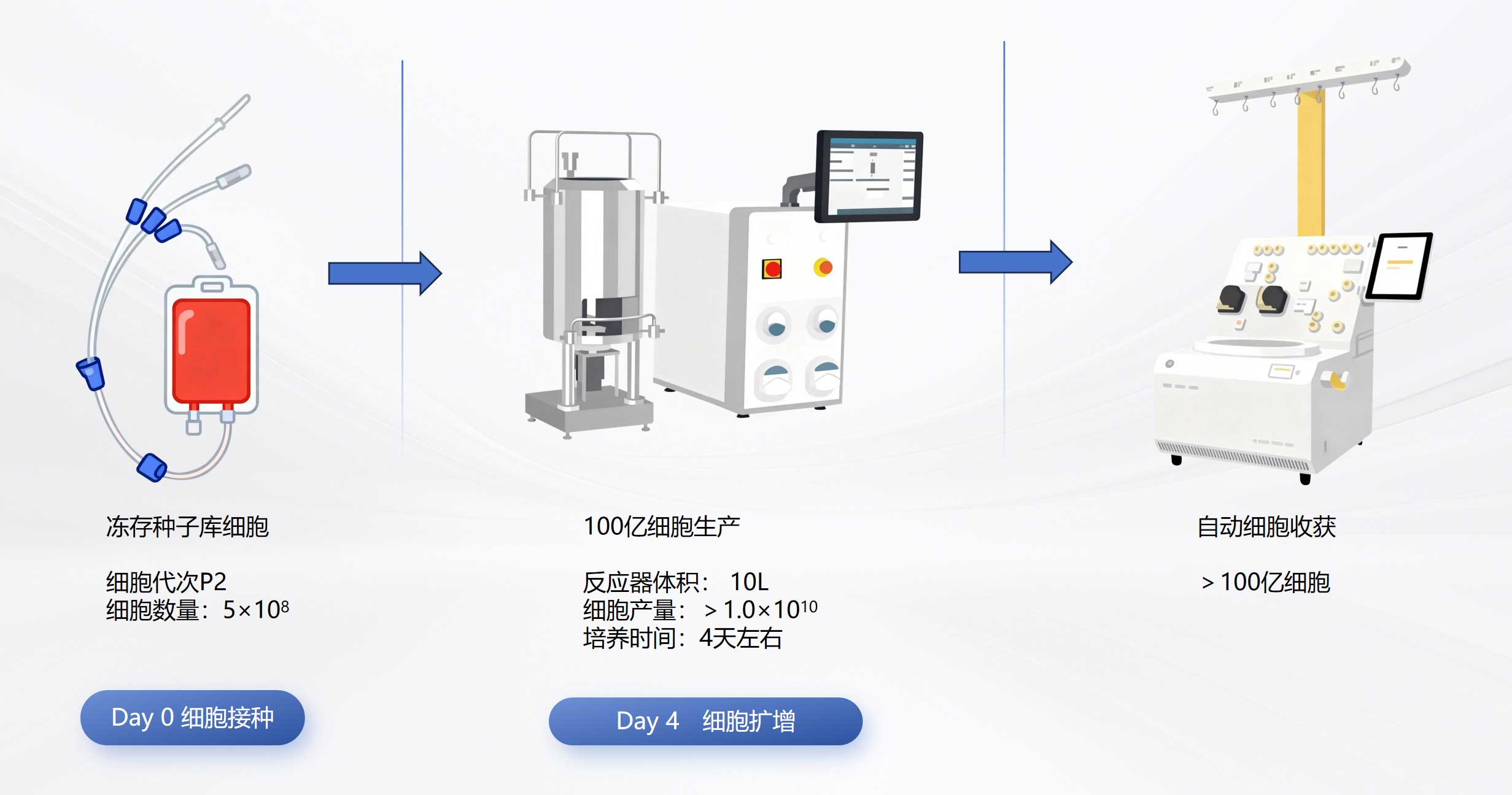 研究团队已成功使用自动化细胞收获装置单批次获得500亿以上细胞并形成制剂,整个生产工艺采用全封闭自动化流程。