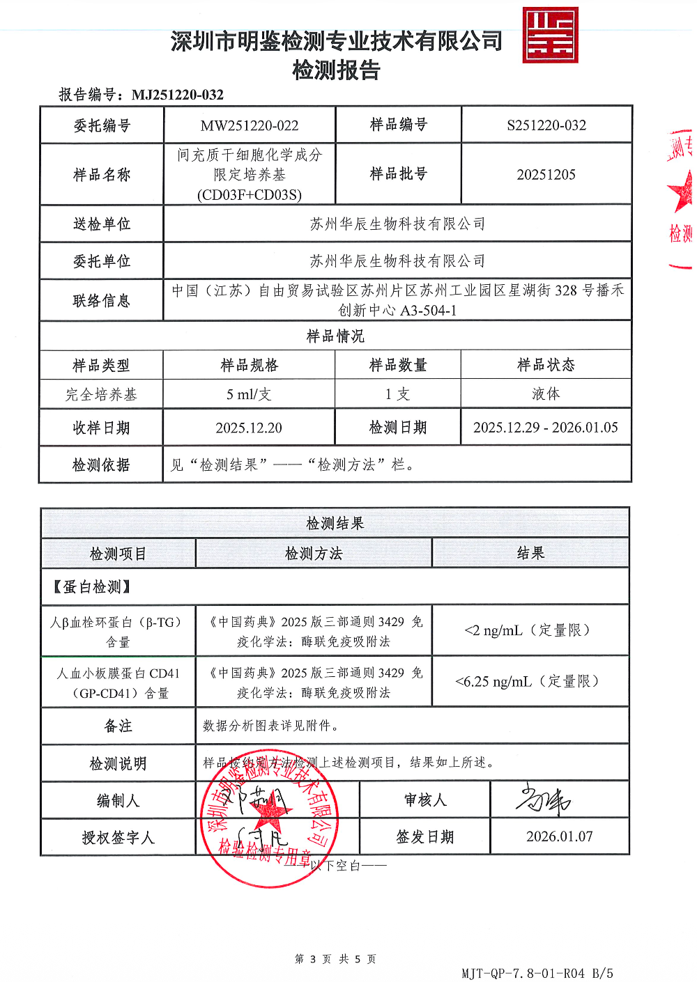 样本A:苏州华辰生物-化学成分限定培养基,无血小板裂解物添加,β-TG检测浓度:0 ng/ml
